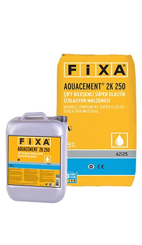 Tanımı Kullanım Alanları: Çimento ve akrilik esaslı, süper elastik, çift bileşenli su yalıtım malzemesidir. Yalıtım sağlamak için iki bileşenin birbiri ile karıştırılması gereklidir. Pozitif su basıncına dayanıklıdır. İç ve dış mekânlarda, yatay ve düşey uygulamalarda, su depoları ve yüzme havuzlarında (üzeri kaplanmak şartı ile), temel perde yalıtımı, istinat duvarları ve bodrum yalıtımında, balkon ve teras çatıların yalıtımında (üzeri kaplanmak şartı ile), sarnıçlar, sulama kanalları, rögarlar, beton borularda, banyo ve mutfak gibi ıslak hacimlerde, Kaplıca, hamam gibi tesislerde, çiçeklik yalıtımında, seramik, granit ve kaplama malzemelerinin yapıştırılmasında kullanılır.